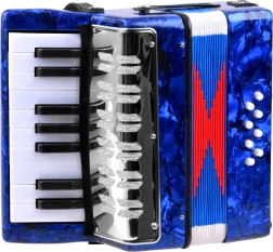 Realistický vzhľad a funkcie – akordeón pre deti vyzerá a funguje ako skutočný nástroj: zvuk vzniká rozťahovaním a sťahovaním mechu, k dispozícii sú klávesy aj basové tlačidlá. Vďaka kvalitnému spracovaniu a lesklému modrému povrchu je atraktívny a odolný.