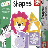 Zoznámte svojho malého bádateľa s tvarmi hravou formou. EDUCA baby vkladačka preskúmaj tvary so zebrou Zakom pomáha deťom od 24 mesiacov rozlišovať štvorec, trojuholník, kruh a obdĺžnik vďaka párovaniu obrázkov zvieratiek s dvoma prepojenými tvarmi.