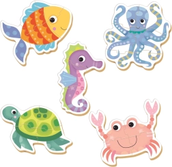 Skladajte rybičku, chobotnicu, koníka, korytnačku a kraba – každý obrázok má iný počet dielikov, takže sa deti prirodzene posúvajú od jednoduchších k zložitejším. Diely sú pevné, dobre sa držia a vďaka výrazným farbám a tvarom lákajú ku hre.