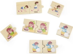 Toto drevené skladacie puzzle od firmy VIGA ponúka dieťaťu možnosť skladať 8 farebných sád puzzle, ktoré ilustrujú rôzne činnosti detí v ich každodennom živote. Zahrnuje popularizované aktivity ako umývanie rúk, beh alebo sfúkavanie sviečok na torte.