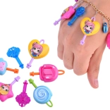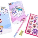- 7 kľúčikov; ceruzka; strúhadlo; retiazka; 2 prívesky na náramky; farebné koráliky; retiazka na náramok; ozdoba – skladacie srdiečko; háčiky; prívesky; samolepky; zápisník; kartónové pravítko s princeznou; záložka s jednorožcom