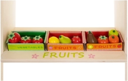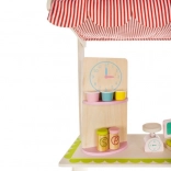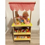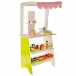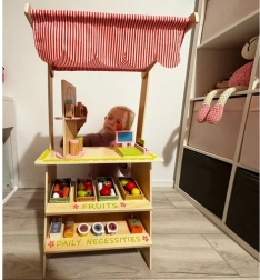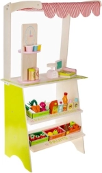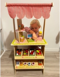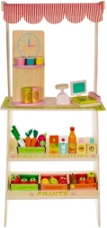 Doprajte deťom vlastné trhovisko! Štýlový drevený stánok so strechou v pruhovanom dizajne, policami a vyznačenými sekciami pre ovocie a denné potreby rozvíja predstavivosť, komunikáciu aj jemnú motoriku. Realistické príslušenstvo – pokladňa so skenerom, platobná karta, váha a otočná tabuľa/„hodiny“ – premení každý nákup na pútavé dobrodružstvo.