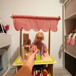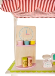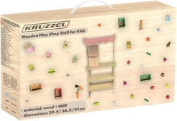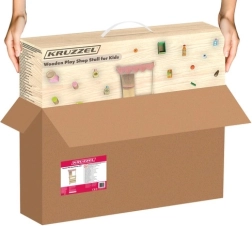 Konštrukcia z masívneho dreva a MDF je stabilná, odolná a prispôsobená malým ručičkám. Všetky prvky majú hladké, zaoblené hrany a zodpovedajú európskym normám pre bezpečnosť hračiek. Vďaka kompaktným rozmerom a premyslenému usporiadaniu sa stánok hodí do detskej izby aj herne.
