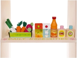 Pokladňa so skenerom, váha, otočná tabuľa a množstvo drevených potravín – všetko, čo deti potrebujú na otvorenie vlastného obchodu a tréning sociálnych zručností.