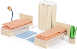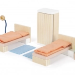 Miniatúrna spálňa pre domček pre bábiky značky Small Foot prináša kúzlo skutočného nábytku do detského sveta. Táto elegantná sada nábytku zahŕňa manželskú posteľ, ktorú možno ľahko rozdeliť na dve samostatné postele, čo ponúka flexibilitu pre rôzne druhy hry. Súčasťou sú tiež dva vankúše, dve periny, šatníková skriňa so zrkadlom, lampa a dva koberčeky, ktoré dotvárajú autentickosť tejto miniatúrnej spálne.