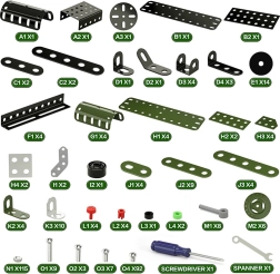 V balení nájdete všetko, čo potrebujete k zloženiu modelu vrátane kovových a plastových dielov, náradia, a nálepiek.