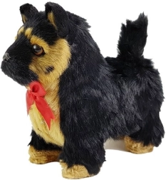Čierno‑hnedá srsť, tmavé oči a červená mašľa dodávajú hračke verný vzhľad a zabezpečujú maximálnu hebkosť na dotyk.