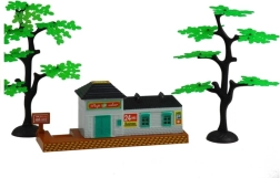 Lokomotíva, nákladný vozeň, 3 menšie vozne, stanica, 2 stromy, koľaje, dávkovač na vodu