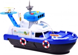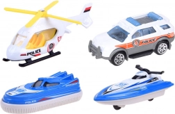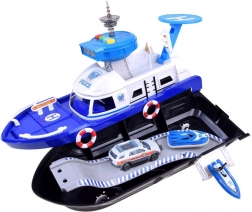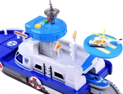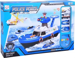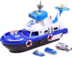 Veľký policajný čln s riadiacou vežou a heliportom, policajná dodávka, vrtuľník, vodný skúter, vznášadlo, menší čln, dráhy pre vozidlá, dopravné značky, kotva