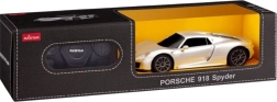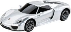 Strieborný model Porsche 918 Spyder verne kopíruje luxusný vzhľad skutočného vozidla, vrátane športového dizajnu a detailných prvkov.