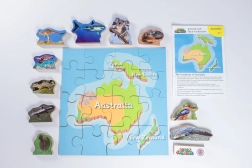 Drevené puzzle Austrália a jej zvieratá 16 dielikov a 10 zvierat