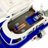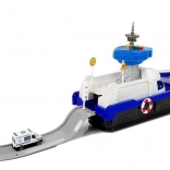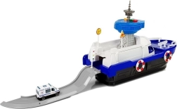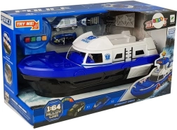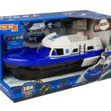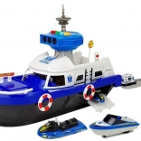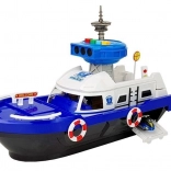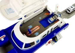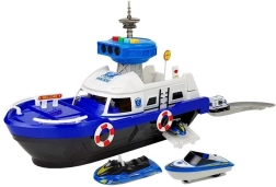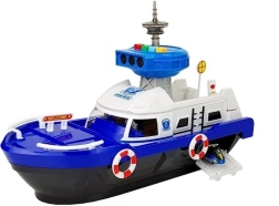 Táto robustná policajná loď na kolieskach ponúka rad interaktívnych prvkov: otváraciu hornú palubu, zadnú nájazdovú rampu pre vozidlá a úkryt pod palubou. Riadiaca veža vydáva policajné signály so svetlom a zvukom (AG13 batérie sú súčasťou). Vďaka detailnému prevedeniu so záchrannými kruhmi a nápismi je hra realistická a pútavá.
