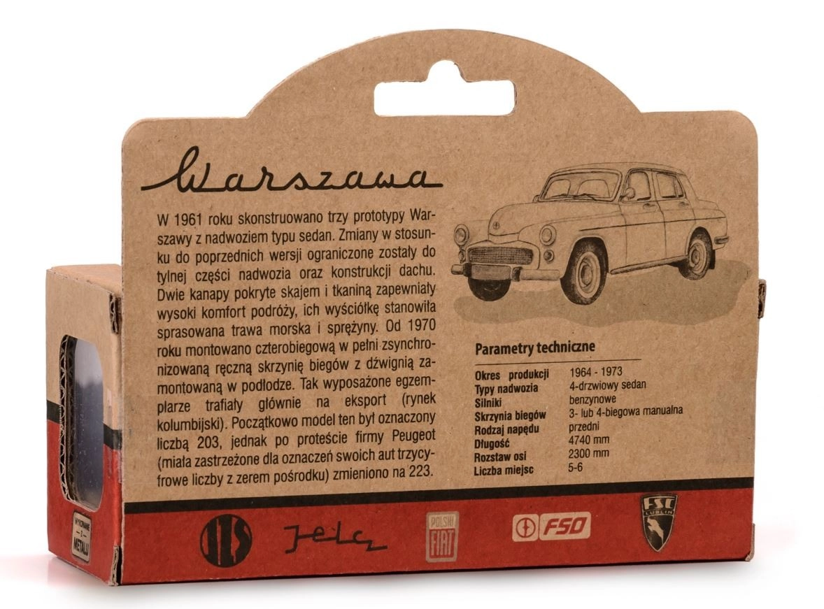 Warszawa 223 je model známeho poľského vozidla, ktorý bol v roku 1961 navrhnutý s karosériou typu sedan. Elegantný dizajn a precízne spracované detaily z neho robia ideálny doplnok do akejkoľvek zbierky modelov áut. Najvýznamnejšie vlastnosti tohto modelu zahŕňajú: