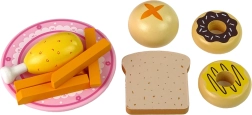 Súčasťou je tanier a výber potravín: donuty, pečivo, hranolky aj kuracia palička – ideálne na servírovanie a hru na kuchára.