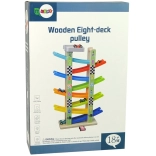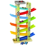 Táto pestrá drevená zjazdová dráha zaujme každé malé dieťa. Každé z 8 poschodí je označené číslom, takže si deti hravou formou upevňujú počítanie a rozlišovanie farieb. Deti položia autíčko na hornú plošinu a sledujú, ako sa po naklonených rovinách svižne otáča a schádza nadol. Zábava, ktorá podporuje logické uvažovanie aj zrakové vnímanie.