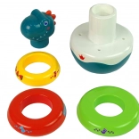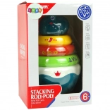 Každý krúžok má inú farbu a tvar s obrázkami, čo podporuje rozvoj zraku, jemnej motoriky a jednoduché triedenie podľa veľkosti.