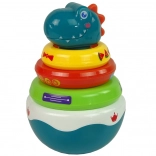 Táto vzdelávacia hračka s veselým dinosaurom kombinuje hrkálku a skladacie krúžky v jednom. Deti môžu krúžky dávať dole a znovu nasadzovať, čím si precvičujú presnosť pohybov, koordináciu oko–ruka a logické myslenie. Kolísavá polguľatá základňa sa hojdá zo strany na stranu, ale nikdy sa neprevráti, a pritom vydáva príjemné hrkavé zvuky.