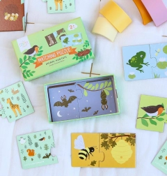 Zábavné priraďovacie puzzle pre deti od 2 rokov rozvíjajú logiku, poznávanie prírody a jemnú motoriku. Obsahuje 10 samostatných dvojíc, v ktorých deti hľadajú, kde zvieratko býva. Dieliky sú z pevného kartónu, majú veľký formát pre malé rúčky a všetko je uložené v praktickej škatuľke pre jednoduché odkladanie.