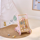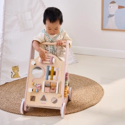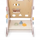 Chodítko obsahuje zrkadlo, otočné kocky a ďalšie aktivity, ktoré podporujú motorické a kognitívne zručnosti.
