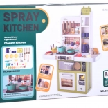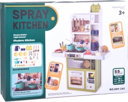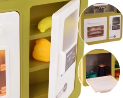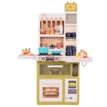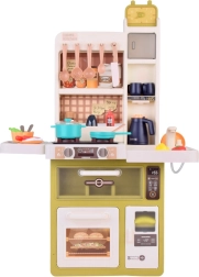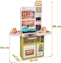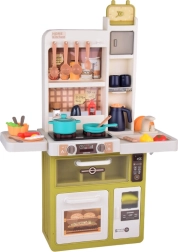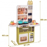 Interaktívna detská kuchynka v krémovo zelenej farbe premení hru na varenie na realistický zážitok: ponúka tečúcu vodu, svetelné a zvukové efekty, tvorbu pary a 55 dielov príslušenstva. S otváracou chladničkou, rúrou a umývačkou a rozmermi 88×61×24 cm rozvíja kreativitu, jemnú motoriku aj sociálne zručnosti.