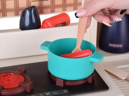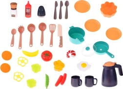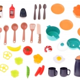- 55 dielov príslušenstva – hrnce, kanvica, tanieriky, šálky, príbor, koreničky a makety potravín.