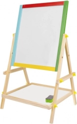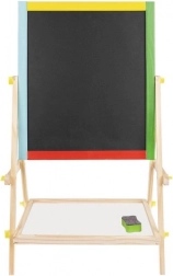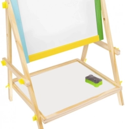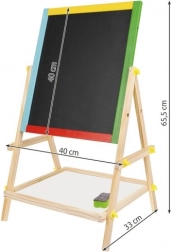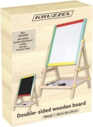 Kreatívna a bezpečná obojstranná tabuľa 2v1 pre malých umelcov – z jednej strany kriedová, z druhej sucho stierateľná a magnetická. Vďaka otočnému mechanizmu, pevnej drevenej konštrukcii a polici na príslušenstvo podporuje fantáziu, učenie aj jemnú motoriku. V balení je všetko potrebné na okamžitú zábavu: kriedy, popisovač a hubka.