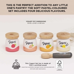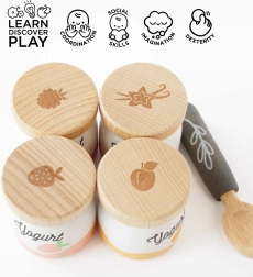 Začnite deň so súpravou drevených jogurtov od Le Toy Van! Obsahuje štyri milé makety jogurtov s príchuťami broskyňa, vanilka, malina a jahoda. Drevené dielky podporujú rozvoj jemnej motoriky a umožňujú deťom skúmať dôležitosť zdravého stravovania.
