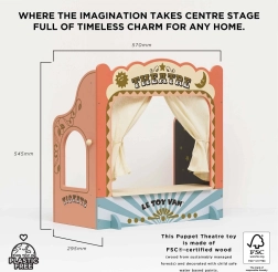 Predstavte si, že sa vaše deti strácajú vo svete fantázie a príbehov. Toto bábkové divadlo je vyrobené z kvalitného dreva s certifikátom FSC a má látkové opony, ktoré dodávajú predstaveniu autentickosť. Dekorované zlatými detailmi a obsahuje aj okienko na predpredaj vstupeniek a popisovaciu tabuľu pre úvod predstavenia. Vnútri sa môže otvoriť nádherná nočná scéna s hviezdami, ktorá vytvára magickú atmosféru.