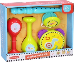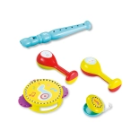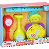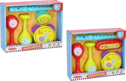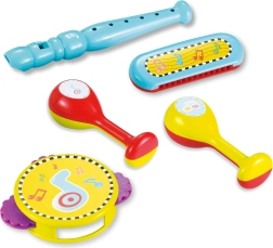 Táto pestrá sada hudobných nástrojov ponúka všetko, čo deti potrebujú na objavovanie zvukov a rytmov. Nájdete v nej rumba gule (2 ks), fúkaciu harmoniku, flautu a tamburínu – kombináciu nástrojov, ktorá podporuje koordináciu, sluchové vnímanie a kreativitu.