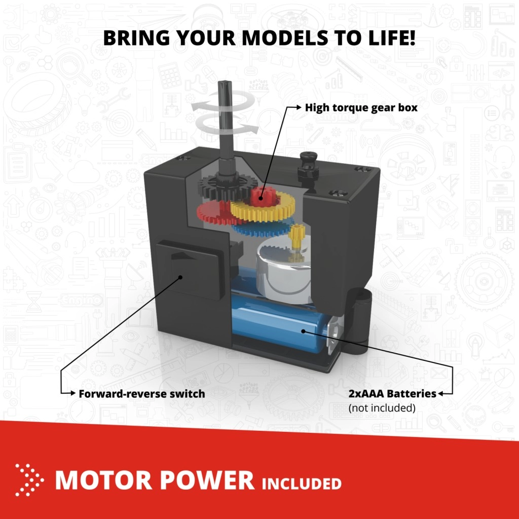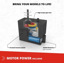 Súčasťou je motorček s nastavením smeru pohybu. Oživte svoje modely a nechajte ich jazdiť či posúvať sa.