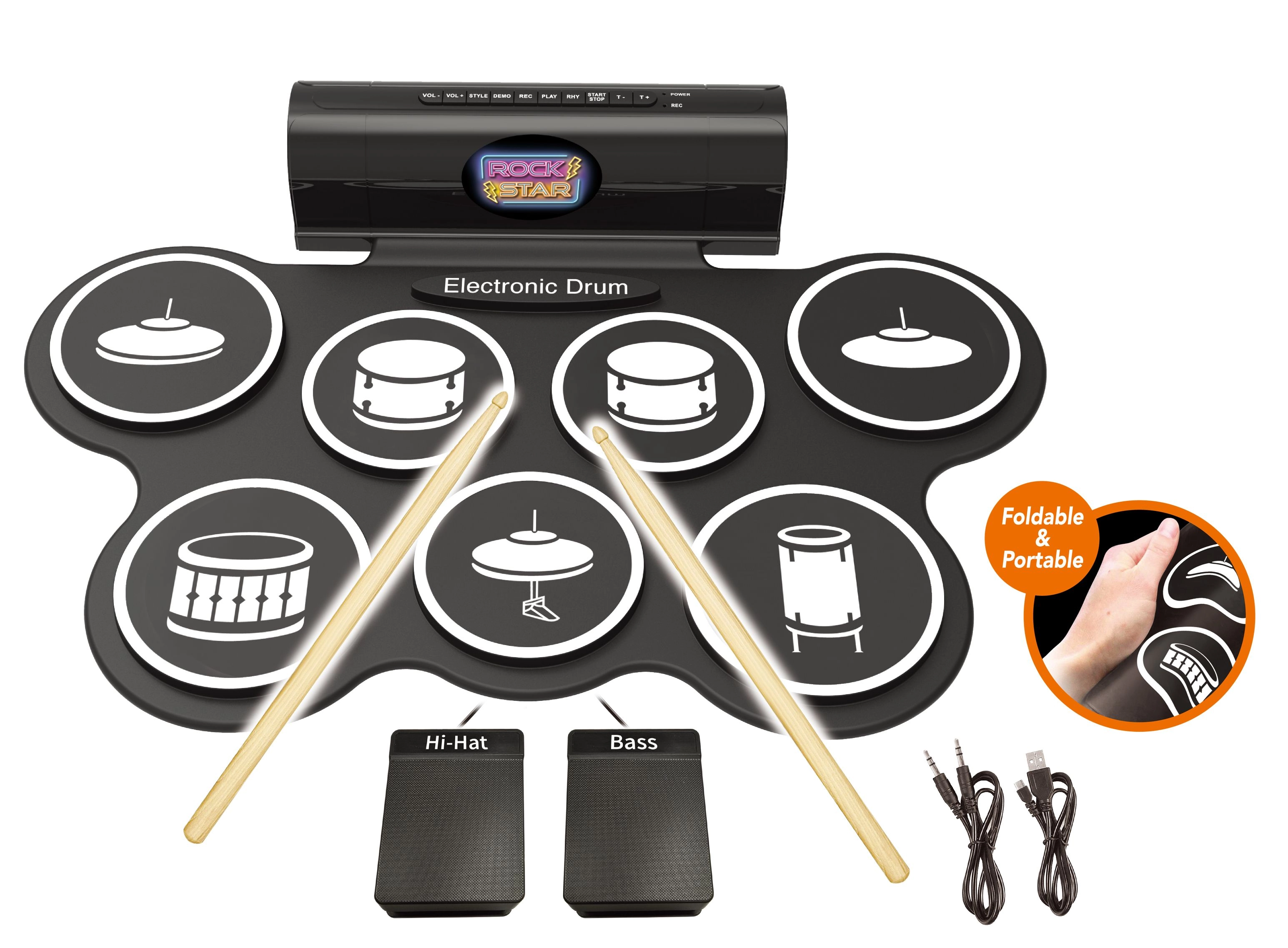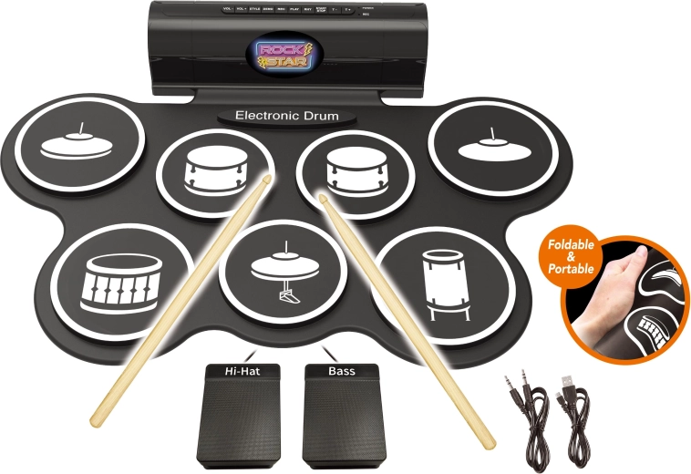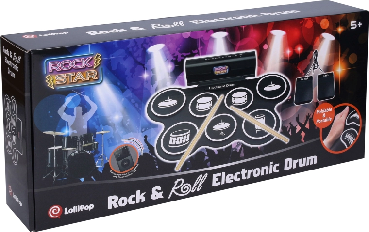 Kompaktná elektronická bicía súprava na domáce hranie aj pre začiatočníkov ponúka 7 realistických zvukov, 2 pedále (hi-hat a basový bubon), svetelné a zvukové efekty a možnosť nahrávania a prehrávania. Súčasťou balenia sú 3× AA batérie, USB kábel aj kábel pre mobil/mp3.