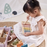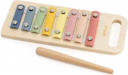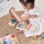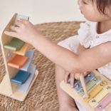 Pastelový drevený xylofón zoznamuje deti so svetom tónov, rozvíja sluchové vnímanie a rytmus a podporuje koordináciu ruky a oka pri úderoch paličkou.