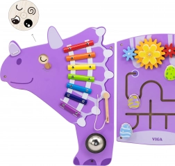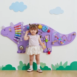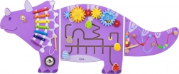 Farebná drevená nástenná tabuľa v tvare triceratopsa od značky VIGA TOYS ponúka množstvo aktivít pre rozvoj detí. Nájdete na nej xylofón s paličkou a zvonček/gong, otáčacie ozubené kolá, labyrint s 5 otváracími vajíčkami (zrkadielko + malí dinosauri), meniace sa oči pomocou gombíka a pútavú päťlu motoričky s vystreľovačom korálikov. Skvelá pre jemnú motoriku, koordináciu oko–ruka a zmyslové objavovanie.