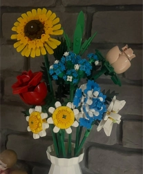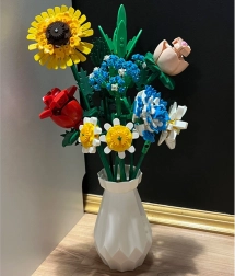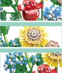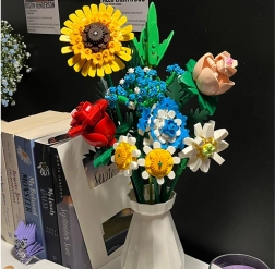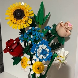 Premeňte stavebnicu na dizajnovú dekoráciu. Farebná kytica zo stavebných dielikov zahŕňa slnečnicu, ruže, karafiát, sedmokrásku, ľaliu, nezábudku a zelené doplnky (listy haitong, céder, tráva). Súčasťou je aj elegantný krémový flakón, takže hotovú kyticu môžete hneď vystaviť na poličke či stole.