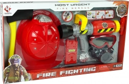 Hasičská sada s vodným hasiacim prístrojom, maskou a červenou helmou