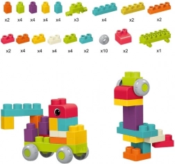 Mäkké a bezpečné stavebnice pre najmenších od 6 mesiacov. Sada obsahuje 62 dielov vrátane 10 koliesok na stavbu vozidiel. Mäkký materiál, zaoblené rohy a možnosť vyvárania pre hygienu podporujú rozvoj motoriky, kreativity a priestorovej predstavivosti.