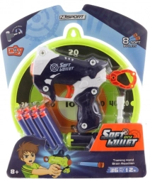Súčasťou sady je terč s bodovým značením, ktorý motivuje k zlepšovaniu výsledkov. Osem mäkkých nábojov s prísavkou sa ľahko prichytí na hladké povrchy, takže je hra bezpečná a čistá. Praktický skrutkovač poteší malých kutilov – skrutkovacie prvky rozvíjajú jemnú motoriku a zručnosť.