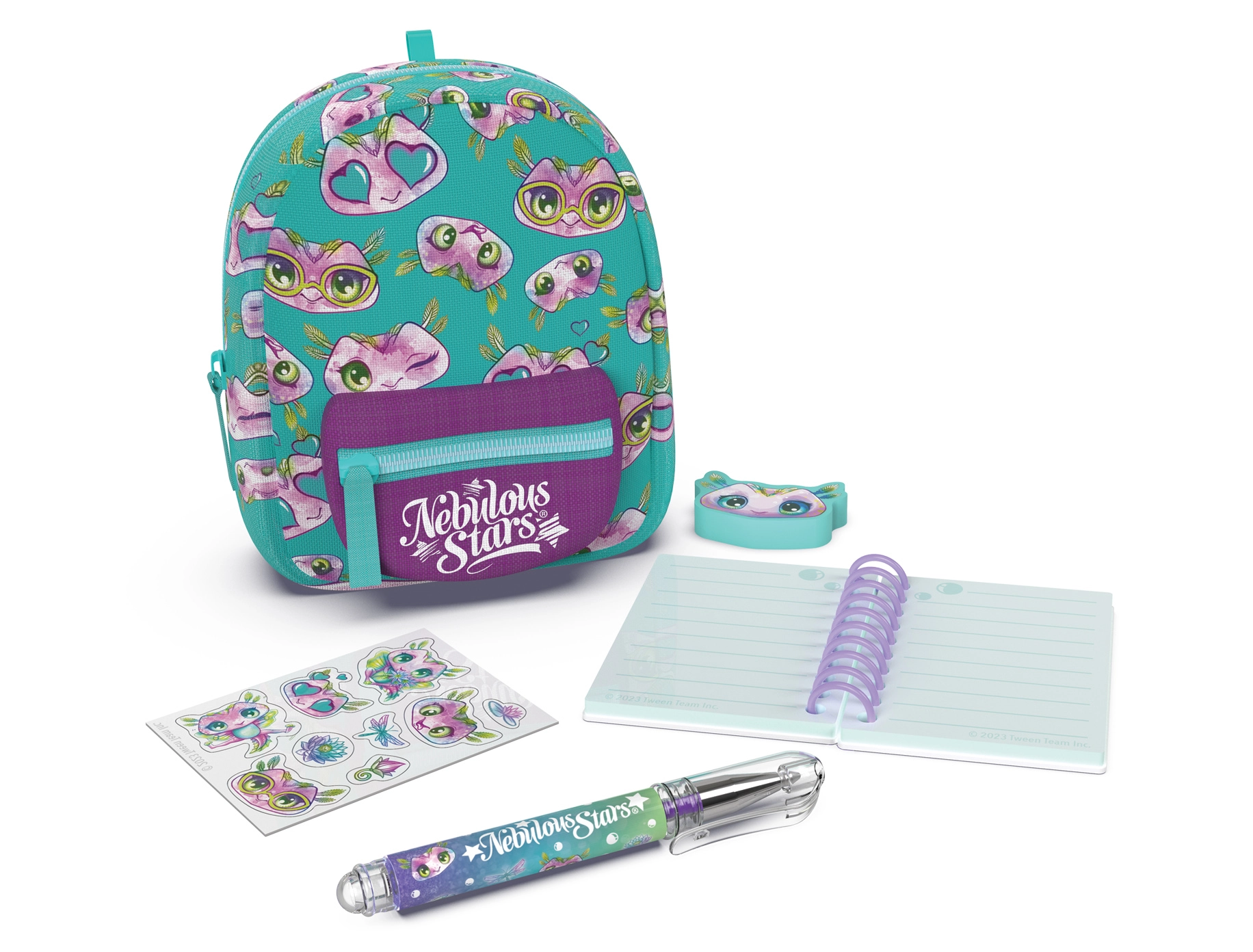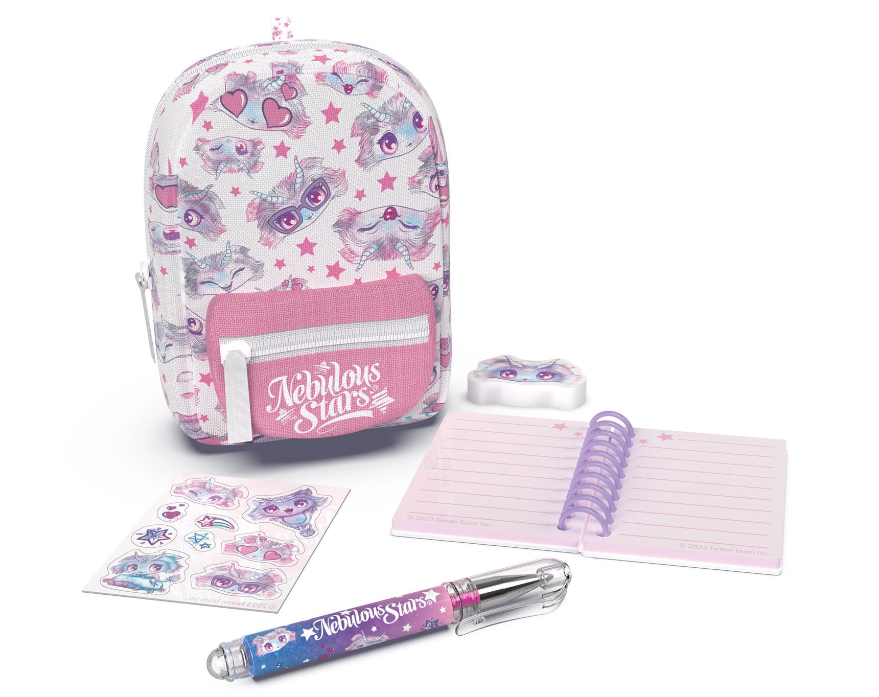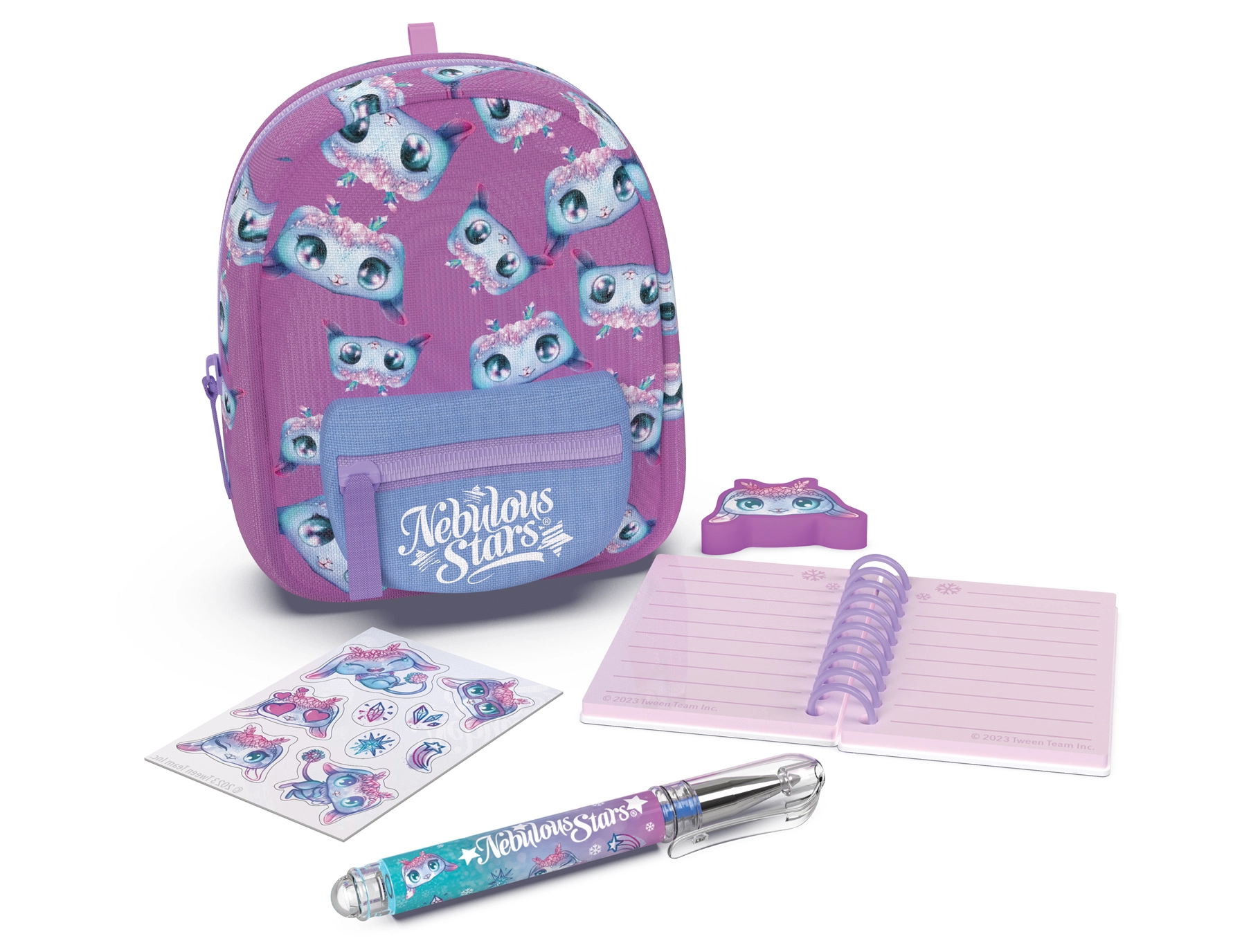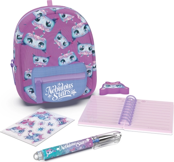 Štýlový mini batôžtek NEBULOUS STARS so sadou papiernictva je ideálny pre malých milovníkov tvorenia aj na cesty. V kompaktných rozmeroch 9 × 6 × 11 cm ukrýva všetko potrebné: linajkovaný notes, pero, gumu, nálepky a roztomilý prívesok. K dispozícii sú 3 farebné varianty – modrá, biela a fialová.