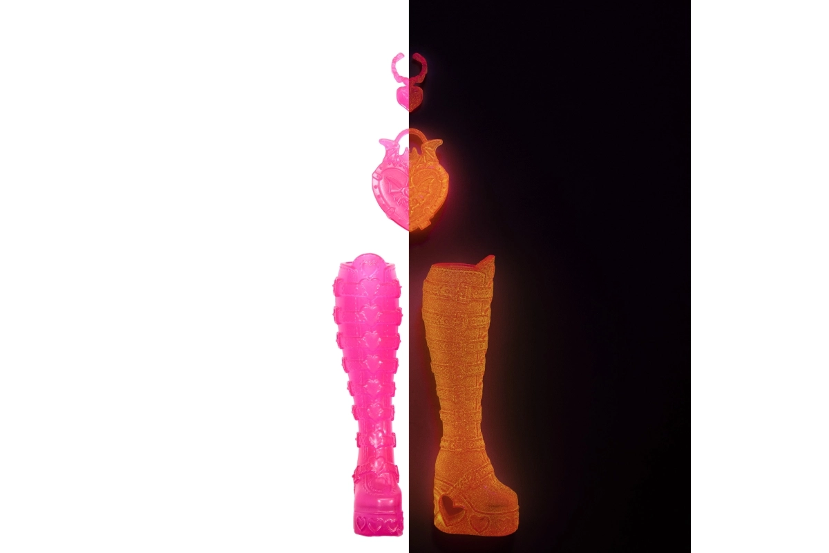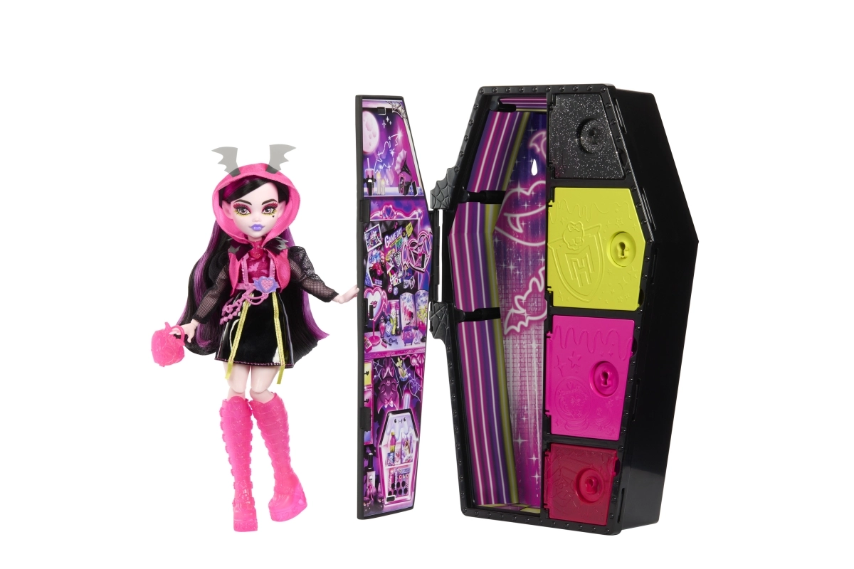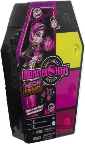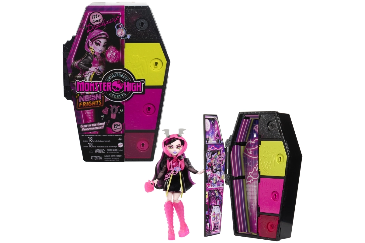 Edícia Neon vracia obľúbené Skulltimate Secrets v ešte žiarivejšom prevedení. Vo vnútri štýlovej skrinky v tvare rakvy čaká bábika s bohatou výbavou, efektmi meniacimi farbu a doplnkami, ktoré v tme žiaria. Hranie tak získava nový rozmer atmosféry a fantázie.