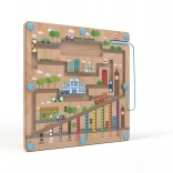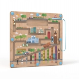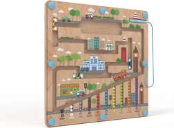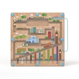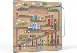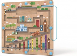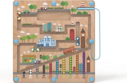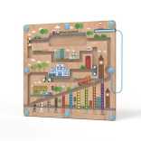 Magnetická hracia doska s motívom mesta ponúka deťom od 2 rokov pútavú aktivitu, pri ktorej pomocou magnetického ukazovadla presúvajú guľôčky po vyznačených cestách. Pevná drevená základňa je krytá priehľadnou plastovou doskou, takže sú guľôčky v bezpečí a nič sa nestratí.