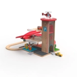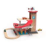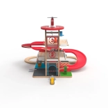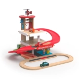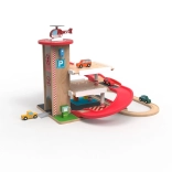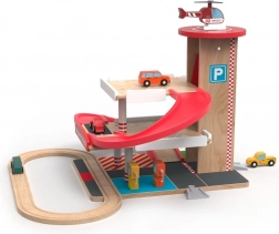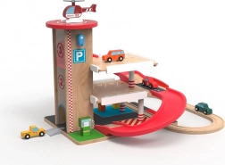 Táto kvalitná drevená garáž s vláčkodráhou ponúka tri poschodia parkovania, funkčný výťah s kľukovým pohonom a heliport na streche. Deti môžu natankovať pri stojanoch na prízemí, vyviezť autíčko výťahom a spustiť ho po červenej špirálovej rampe späť dolu, kde plynule nadviaže na koľaje. Odolné materiály a premyslené detaily zaručujú dlhú životnosť a bezpečnú hru.