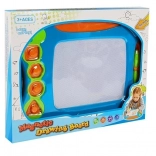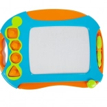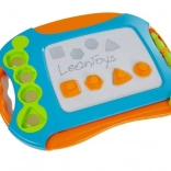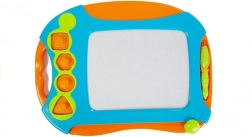 Súčasťou sady je veľká tabuľka s praktickou rukoväťou, magnetické pero a štyri pečiatky v podobe geometrických tvarov. Odolné plastové prevedenie, príjemné farby a premyslené detaily z nej robia ideálnu hračku na doma, do škôlky aj na cesty.