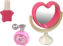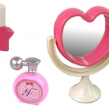 Srdiečkové zrkadielko na stojane, „lak“ na nechty a „parfém“ (imitácia) podnecujú fantáziu a podporujú hru na role v detskom salóne krásy.