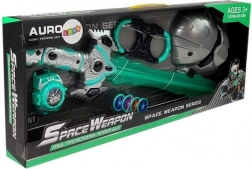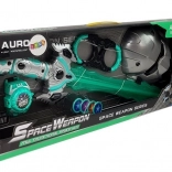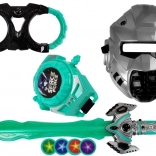 Svetelný meč vytvára zvukové a svetelné efekty ako pri skutočných vesmírnych súbojoch. Vyskúšajte ho v tme! Set tiež obsahuje masku, vďaka ktorej bude váš malý bojovník vyzerať ako pravý vesmírny vojak. Celý set je v čierno-strieborno-tyrkysových farbách. Diskový vystreľovač a putá pomôžu zajmúť protivníka.