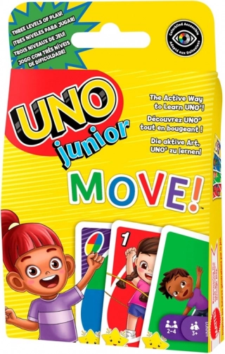 Objavte UNO Junior Move – svižnú detskú variantu legendárnej kartovej hry. Cieľ je jasný: zbaviť sa všetkých kariet. Ale pozor, špeciálne karty s pokynmi pridávajú do hry pohyb a zábavu: skoč na mieste, urob pár drepov alebo trikrát zatlieskaj. Každé kolo je tak aktívne, veselé a nepredvídateľné.