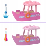 Farebná loď sa otvorí do hernej scény s jasne žltou šmýkačkou a tyrkysovým srdcovým bazénikom – pripravené na kopec vodnej zábavy.