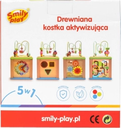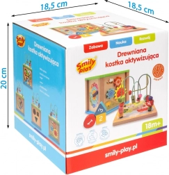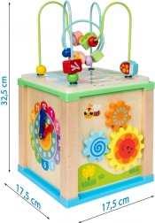 Korálkový labyrint, hodiny, tvarový sorter, posuvné prvky a pletence prinášajú rozmanitú hru a učenie v jednej drevenej kocke.