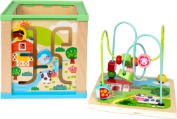 Drevená aktívna kocka 5v1 ponúka labyrint s korálkami, hodiny s pohyblivými ručičkami, prekážkovú dráhu s motívom farmy, tvarový sorter a prekladače/pletence pre zábavné učenie. Podporuje jemnú motoriku, koordináciu ruka–oko a logické myslenie, je vyrobená z kvalitného dreva s netoxickými farbami.