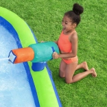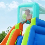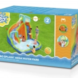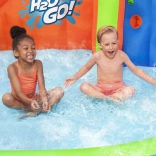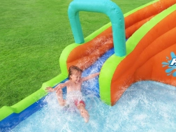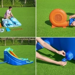 Vodný park Bestway H2O GO! je all‑in‑one atrakcia pre aktívnu vodnú zábavu na záhrade. Robustná šmykľavka s hornou plošinou chránenou sieťou vedie do priestranného bazéna, zatiaľ čo integrovaný rozprašovač a prekvapivé výklopné vedro udržujú šmyk aj deti príjemne mokré. Vďaka rýchlemu nafúknutiu výkonnou dúchadlou je park pripravený na použitie za menej než 2 minúty.