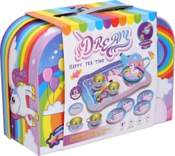 Štýlová čajová súprava s motívom jednorožca prinesie radosť do každej detskej hry na domácnosť. Vďaka pevnému kovovému prevedeniu vydrží aj nadšené každodenné servírovanie. Farebný kufrík s rukoväťou umožňuje jednoduché prenášanie a uloženie všetkých dielov na jednom mieste.